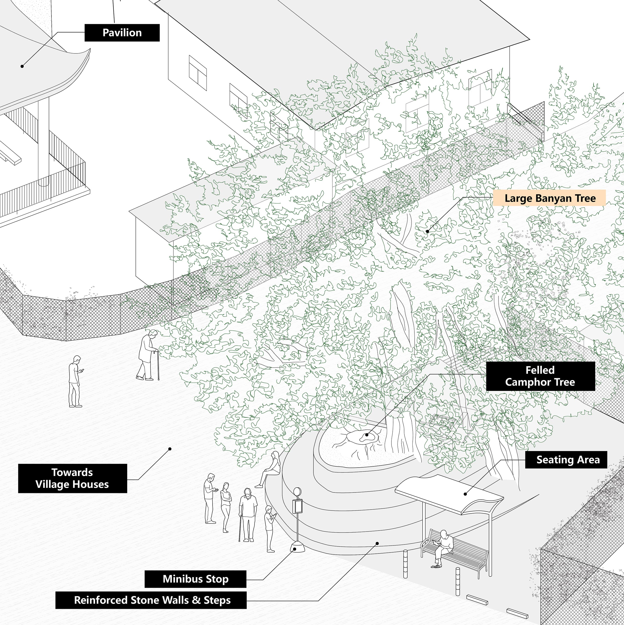 Villagers of Ha Wan Tsuen do not share the same surname; the village also does not have indigenous inhabitants, hence no customs to pass on. What connects villagers with traditional culture for over a century is the large Ficus microcarpa (banyan tree) next to the rain shelter and the basketball court.