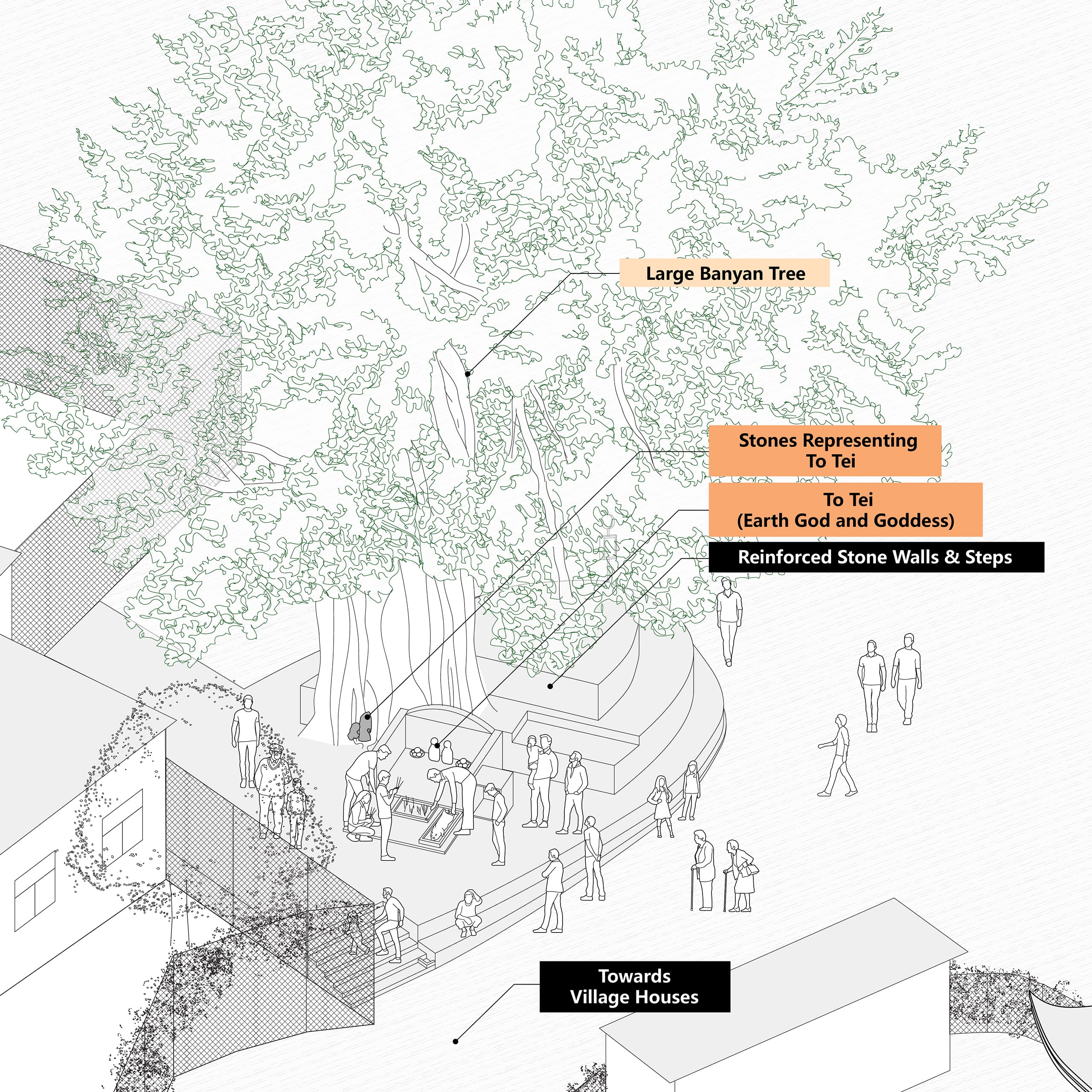 To protect this precious banyan tree and the shrine of To Tei, villagers and worshippers have reinforced the shrine’s structure, with stone walls and steps built under the tree hoping to stabilise the roots. Under the care of villagers for years, the banyan tree thrives and remains healthy.