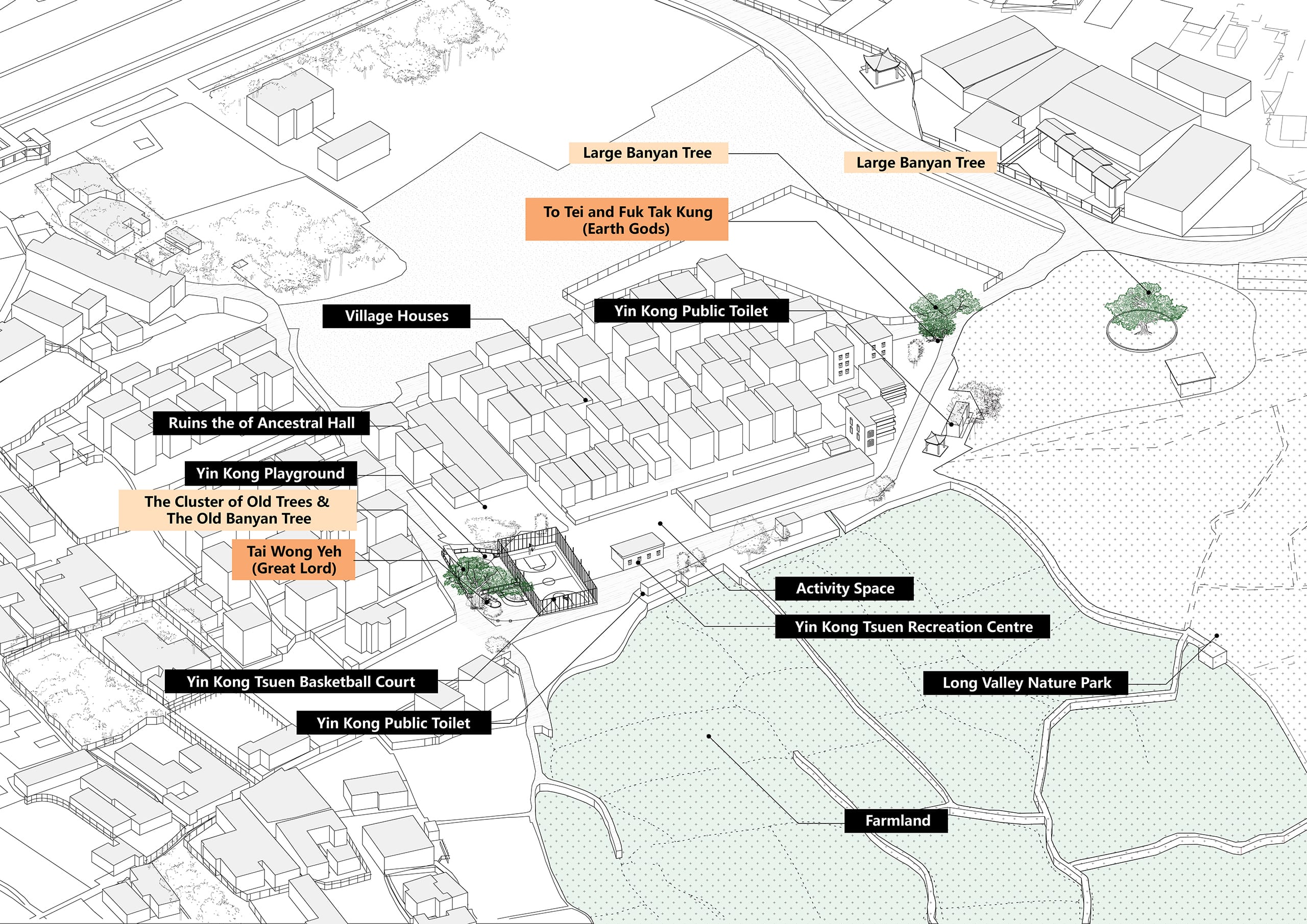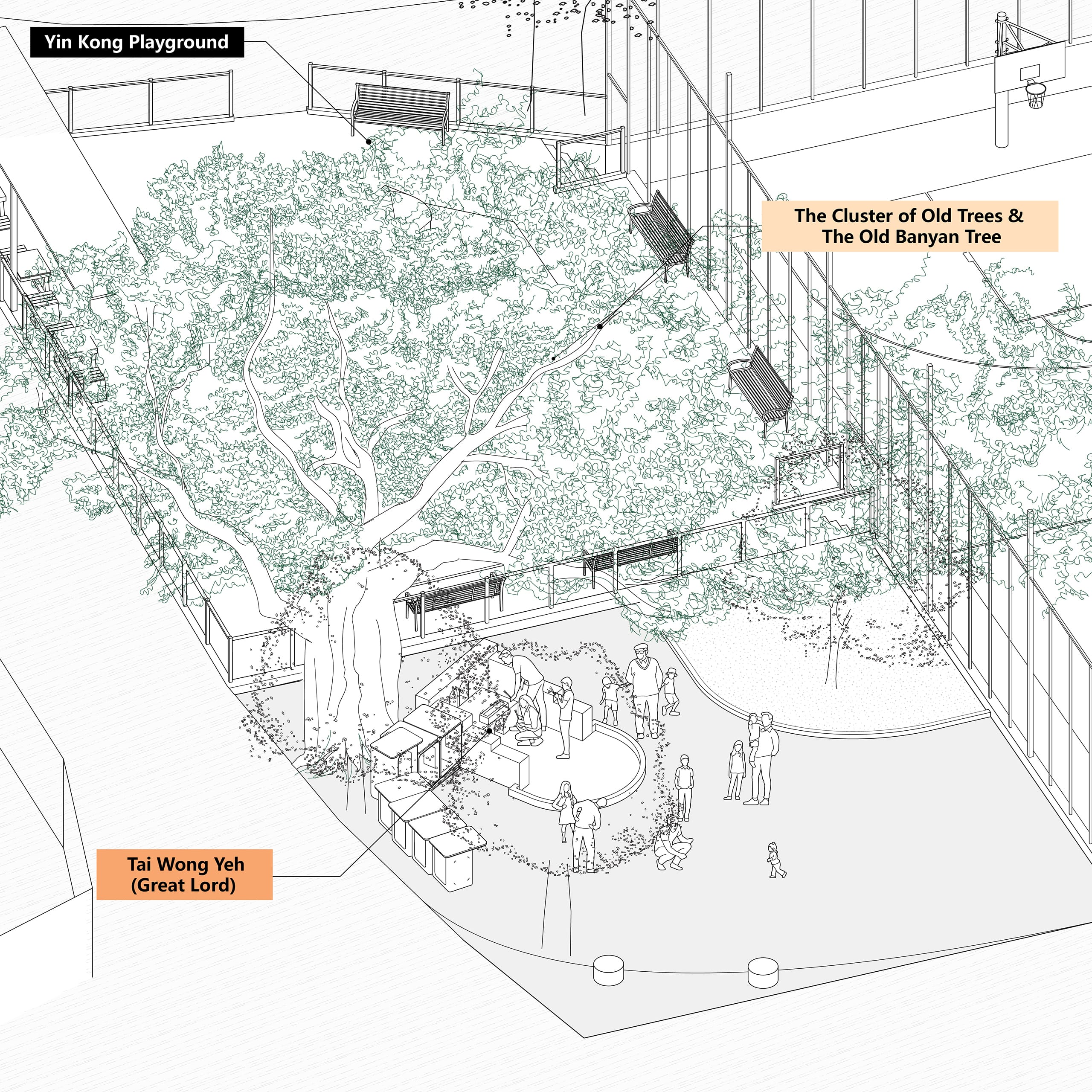 For the Yin Kong villagers, the cluster of old trees and the old banyan tree hold unique significance and spiritual meanings. The cluster, formed by Cleistocalyx nervosum (water banyan), Ficus microcarpa (banyan tree) and Cinnamomum camphora (camphor tree), is located next to the sports ground. Beneath the trees are many deities, including the Tai Wong Yeh (Great Lord). While no extra care is dedicated to this group of old trees, villagers do consider it home to the statues of deities. Quite a lot of villagers would place their household deities under these old trees before when they need to relocate.