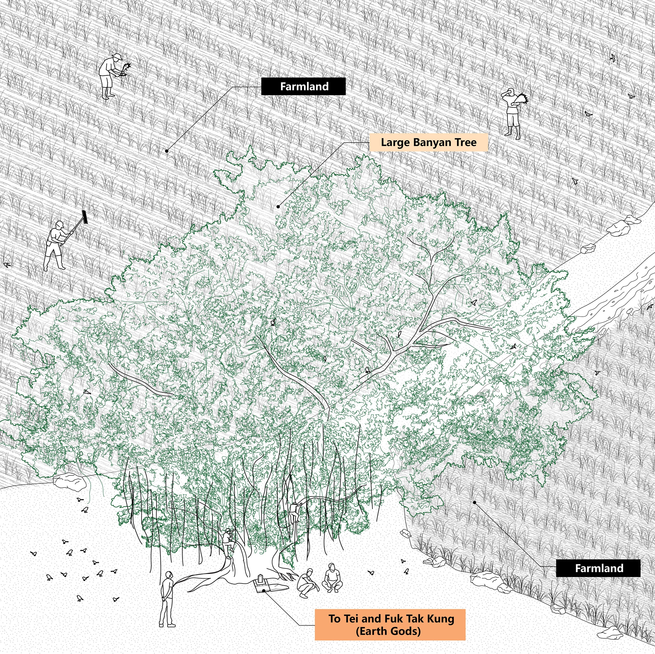 The cluster of old trees and the old Ficus microcarpa (banyan tree) are dedicated to different deities respectively. Together, the deities guard the village with blessings. The trees, therefore, have become the feng shui trees of Yin Kong Tsuen.